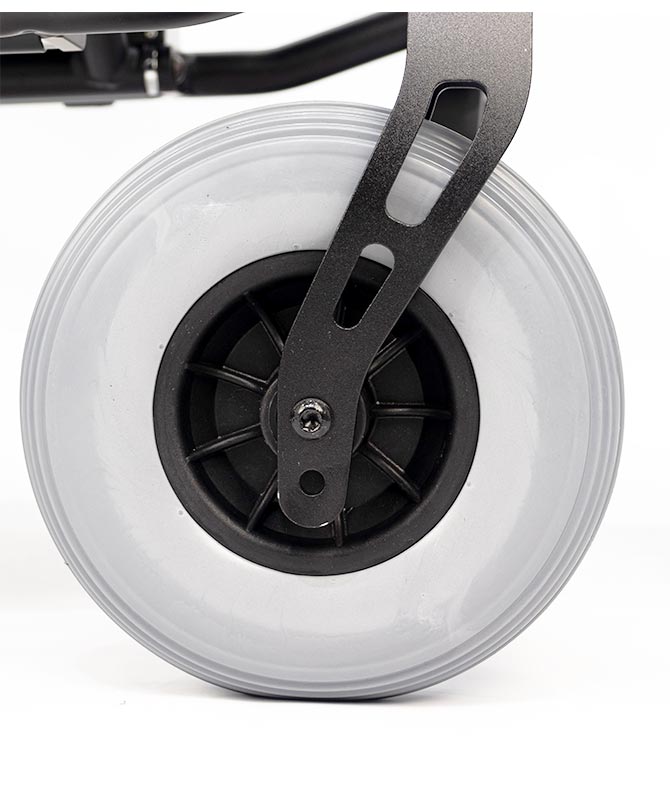 O modelo conta com rodas traseiras em alumínio e pneus PU anti-furo, garantindo maior durabilidade. Seu sistema de suspensão e estrutura reforçada permite um deslocamento estável em pisos lisos e levemente irregulares.