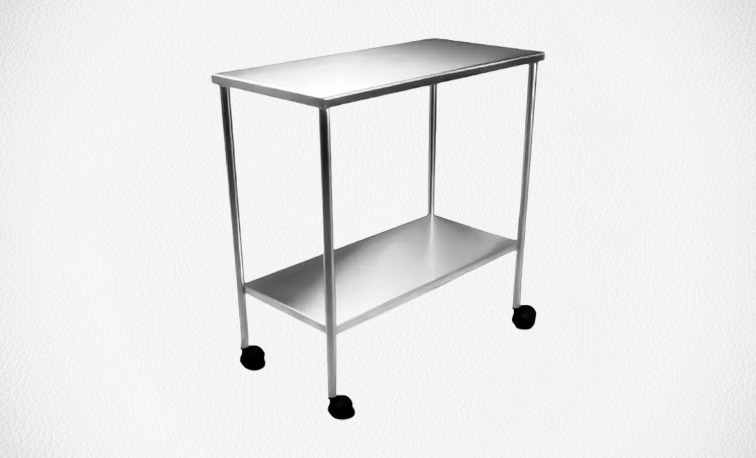 Mesas auxiliares para apoio em procedimentos e instrumentação.