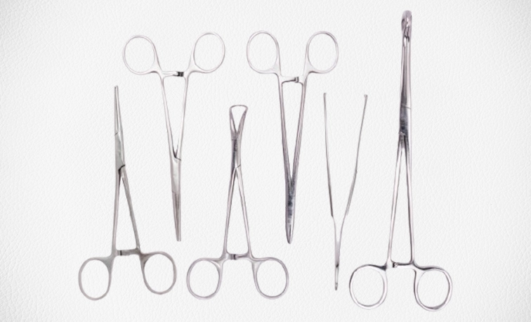 Tesouras e Pinças cirúrgicos para procedimentos com precisão.